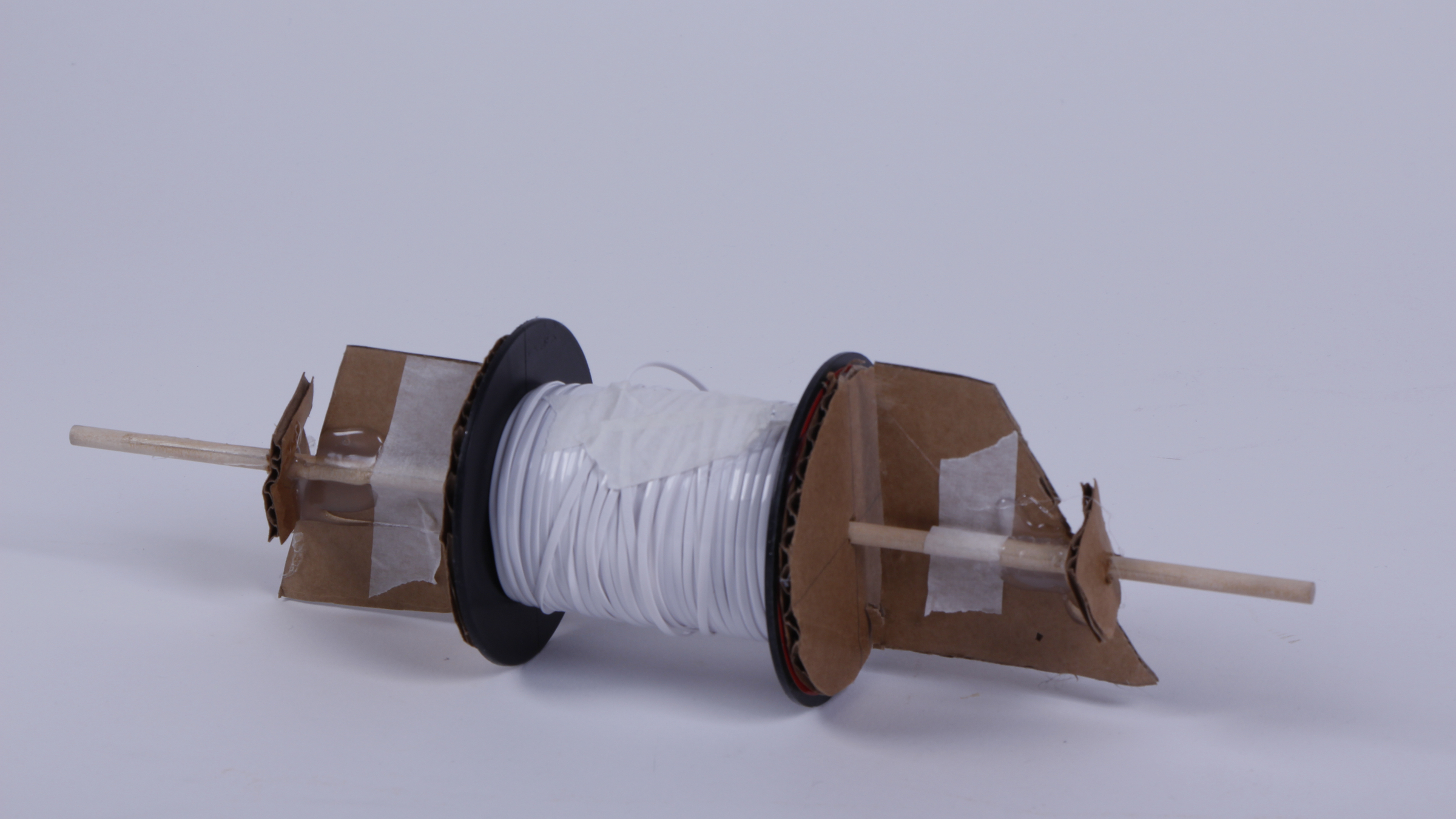 Here we made wheels out of cardboard and attached it to dowels, the axels. We put the dowels in the straws to allow the wheels to move. We added clay on the base to add more weight, allowing the wheels to spin more; carrying it further.