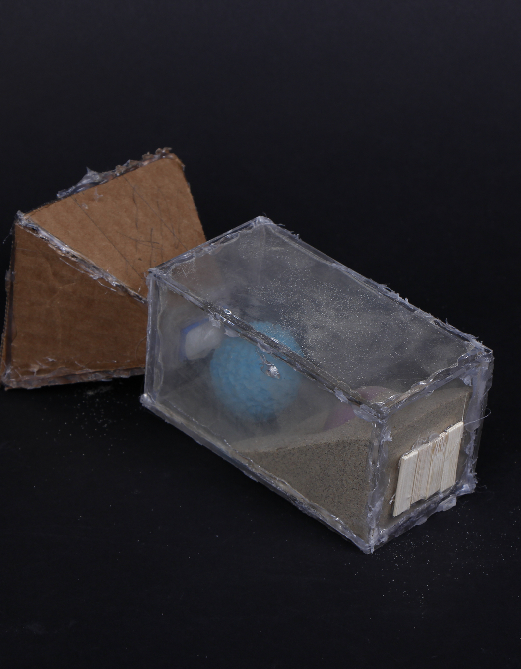 The Time and Tension box is a tool that represents the past ice age version of earth and a future apocalyptic version of earth. By using sand a fan can move and cover a world to show the other world. Research says that sand can be therapeutic and help reduce anxiety and stress. The box was made to help reduce stress in any user and help the user relax. The box is small so it can be placed in many different places.