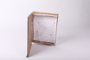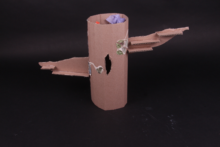 After this I began to turn my ideas into paper prototypes and later more finished cardboard prototypes. I made a paper prototype of a trampoline, an old fashioned TV, and a paper prototype of a tree with shelves for books and a hollow and very colorful inside. I also made a cardboard version of that where I incorporated more nature, and bookshelves on branches on the outside of the tree.