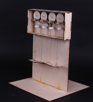 The project that I developed the most was based on a memory my client Lloyd had about his mom having a bike accident. The way Lloyd chose to represent this is by making a bike going around a lumpy wheel that had broken spokes and a lightbulb in the center. The bike on the lumpy wheel represented before the accident, the spokes represented the accident itself, and the lightbulb represented new beginnings and hope. I tried to make my version more abstract. My version has four tiles moving up and down in a wavelike pattern controlled by cams. This represents the usual flow of life; then the tiles start moving more jaggedly, and the tiles shake, but then the tiles start smoothing out back into a smaller pattern to the wave but different. This represents new hope or new beginnings.