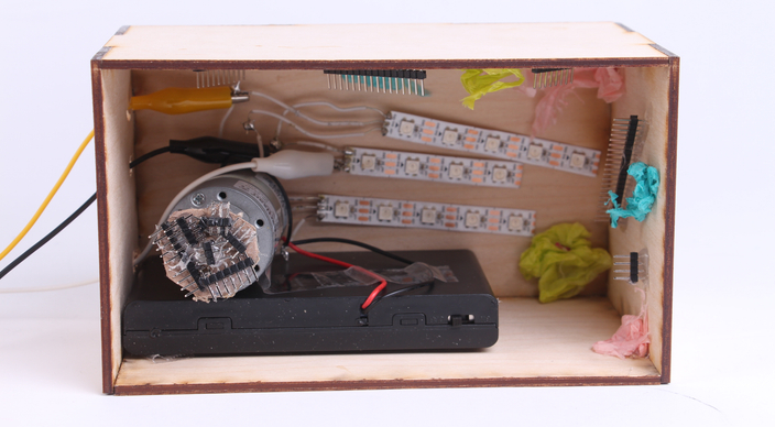 I learned a lot in Electronic Vessels, and grew in many ways. On the first day, I learned how to use copper tape, LEDs and a lithium battery to light up the LED. Also, throughout the studio I learned little bits of Arduino code. I practiced physical fabrication skills including learning how to use the laser cutter and other power tools in the shop. I learned how to solder and I learned how to use Arduino to power lights and servos. I learned how to use different mechanisms for different uses. I learned how to use 3-d printers to enhance the quality of my projects, and lastly I learned how important iteration can be when fabricating, because if we never iterate, then we miss out on thousands of ideas and possibilities.