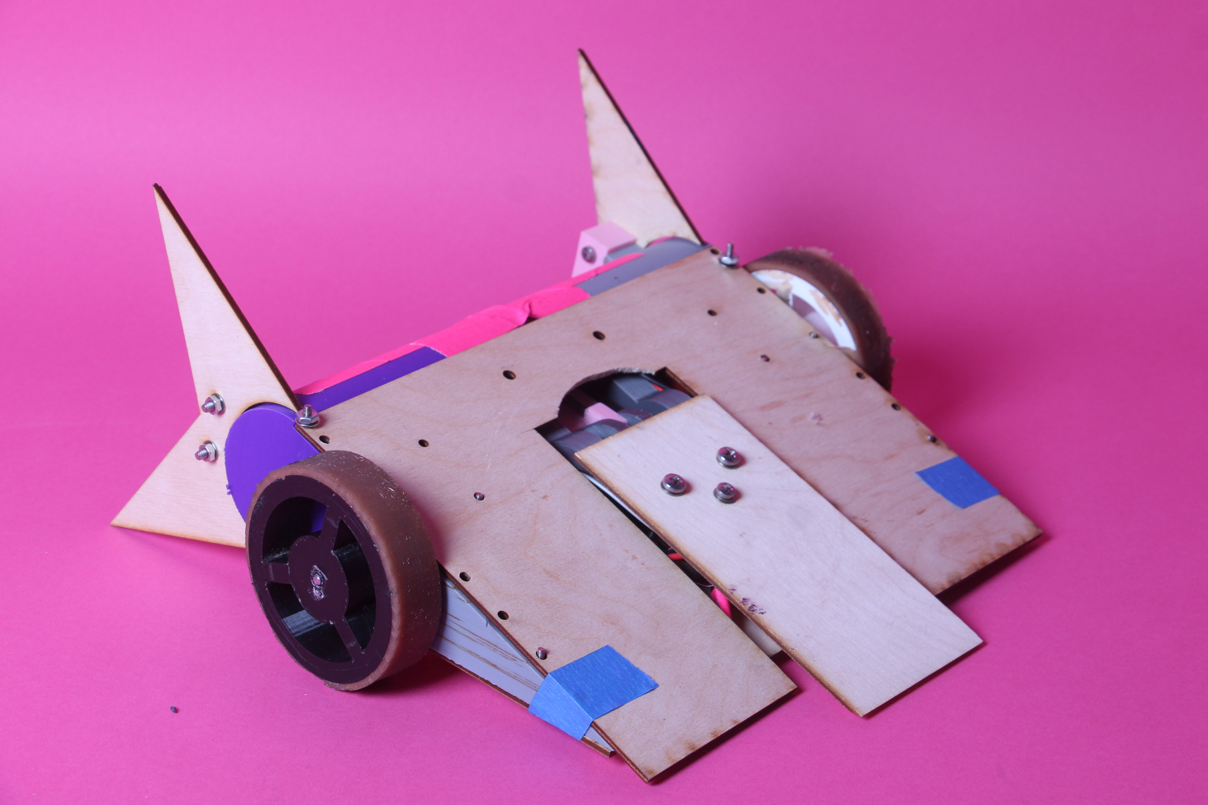Throughout our process we took videos of ourselves making this battle bot and by the end of it, we compiled these videos into a short inspirational montage of the last 3 weeks. The actual process of building the battle bot was segmented into different design sections: The flipping mech, Materials, Wheels, Wedge Shape, Chassis, and Electronics. Collaboration was key to the success of this project. Knowing this, we prioritized communication and challenged ourselves to keep our goals unified and defined. Iteration was also at the core of our work flow.