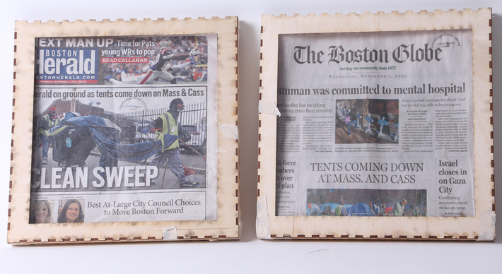 During OI, I practiced my skills in collaboration with my team which consisted of two students in person and one student across the states who was with us via Zoom. We learned how to communicate better with our partner on Zoom after the first week by enforcing a schedule and being very clear with descriptions of ideas and articulating our thoughts. The concept we started the project with was to make a book which presented different communication mediums through history. Now, after many different iterations for our concept, we have landed on following a specific news story - Mass and Cass - and presenting it through many outlets of information such as social media, newspaper, magazines, news sites and radio. by the least week, we had to fabricate the entire exhibit in order for it to convey our idea clearly, and will and I stayed late working on making the physical prototype and installing it.