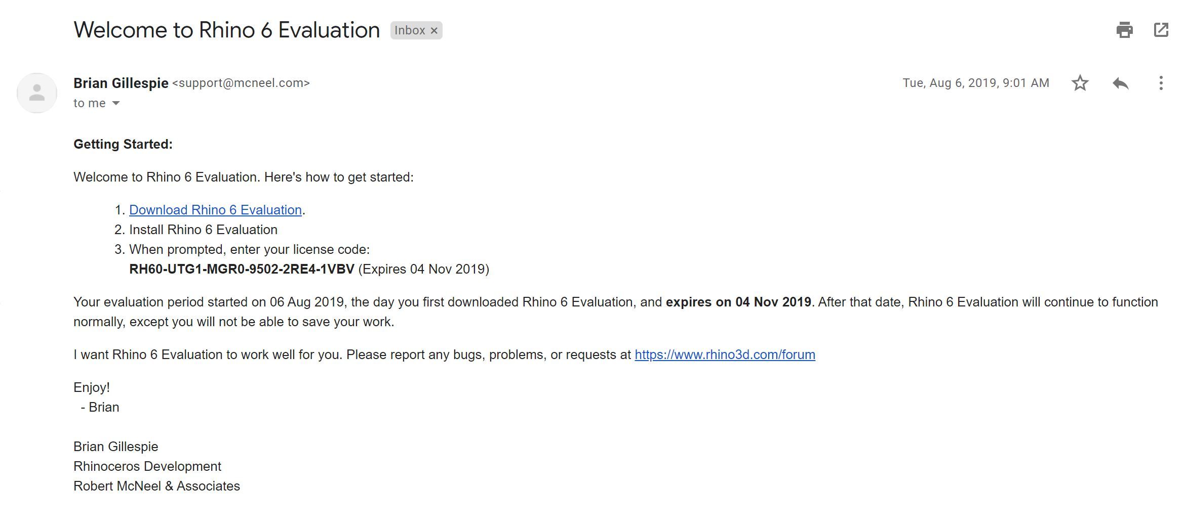 2. Go to your email and open your "Welcome to Rhino 6" email. If you do not see it in your inbox, please check your trash/junk/spam folder. The email will look like this